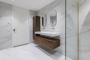 The trendy bathroom with beautiful marble tiles is centrally located in the apartment. The spacious bathroom features a double sink with a stylish wooden vanity unit, gold faucets and two mirrors. The walk-in shower is equipped with a stunning gold rain shower.