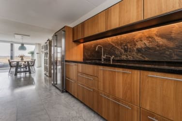 De keuken is voorzien van diverse inbouwapparatuur, waaronder een inductiekookplaat, stoomoven en Quooker, en biedt volop werk- en bergruimte. Dankzij de grote schuifpui en het extra raam in de steeg voelt de woonkamer bijzonder licht en ruim aan.