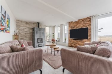 Een echte blikvanger in de woonkamer is de prachtige Tulukivi (Finse) speksteenkachel, die zorgt voor een aangename en gelijkmatige warmte en een sfeervolle uitstraling.