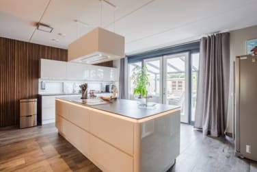 De stijlvolle keuken vormt het absolute middelpunt van de woning en is uitgerust met luxe inbouwapparatuur, waaronder een Quooker, een Siemens oven met stoomfunctie, een Atag combimagnetron, een grote Siemens inductiekookplaat en een design afzuigkap met geïntegreerde lichtinstallatie. Deze keuken is een droom voor iedere kookliefhebber. De begane grond is voorzien van vloerverwarming, wat zorgt voor een aangenaam en gelijkmatig woonklimaat.
