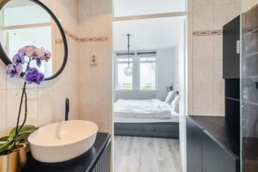Binnenkomst in de centrale hal, die toegang geeft tot alle vertrekken van de woning. Aan de linkerkant bevindt zich de ruime slaapkamer. Via deze slaapkamer heb je directe toegang tot de badkamer. De afwerking is netjes en de badkamer is gemoderniseerd met een inloopdouche.