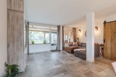 Via de entree kom je in de hal met toilet en trapopgang. Hier bevindt zich ook de deur naar de inpandige schuur.