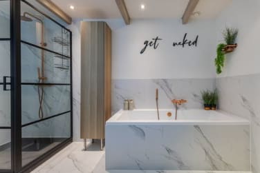Moderne badkamer met ligbad, douche en wastafelmeubel. Ruime slaapkamer voorzijde en een zeer grote master bedroom, voorzien van airconditioning, met toegang tot dakterras.